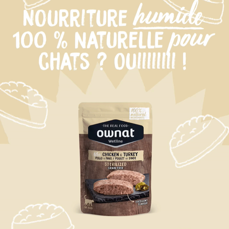 Avec la Ownat Wetline Poulet & Dinde Stérilisés, vous offrirez à votre chat un aliment exceptionnel qui s'adapte non seulement à ses besoins spécifiques, mais qui lui offre également un goût incroyable et une nutrition de haute qualité.