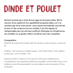 Composition : Dinde (35 %), poulet (35 %), bouillon (28,7 %), minéraux, huile de saumon, cresson (0,1 %).