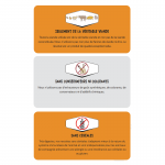 Additifs : Additifs nutritionnels : Vitamine D3 200 UI, Vitamine E 20 UI, Taurine 1 500 mg, Zinc (sulfate de zinc, monohydraté) 25 mg, Manganèse (sulfate manganique, monohydraté) 1,4 mg, Cuivre (sulfate de cuivre (II), pentahydraté) 1 mg, Iode (iodate de calcium anhydre) 0,75 mg.