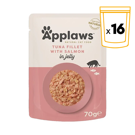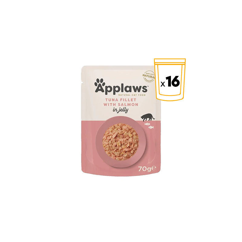 Applaws Chat Adulte Filets de Thon et Saumon en Gelée est présenté dans des sachets de 70 grammes, dans un paquet de 16 unités, offrant des portions idéales qui conservent toutes les propriétés et la fraîcheur des ingrédients. La gelée naturelle non seulement améliore le goût, mais assure également une digestion facile, rendant cet aliment parfait même pour les chats les plus exigeants.