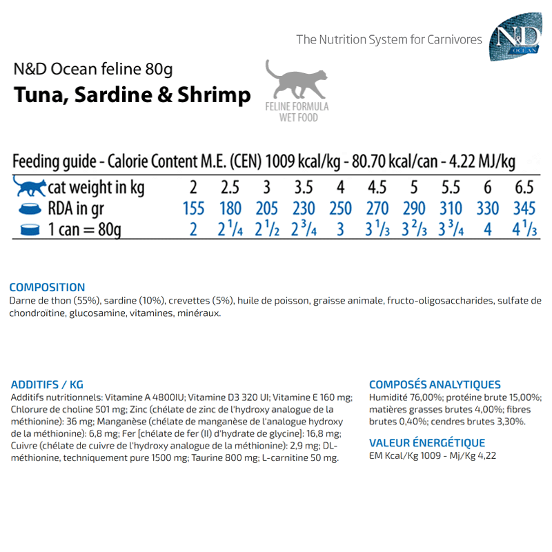 Découvrez N&D Ocean Feline, un choix complet et nutritif spécialement conçu pour les chats adultes. Avec une exquise combinaison de thon, de sardine et de crevettes, cette nourriture humide offre une expérience culinaire exceptionnelle pour votre félin en croissance.