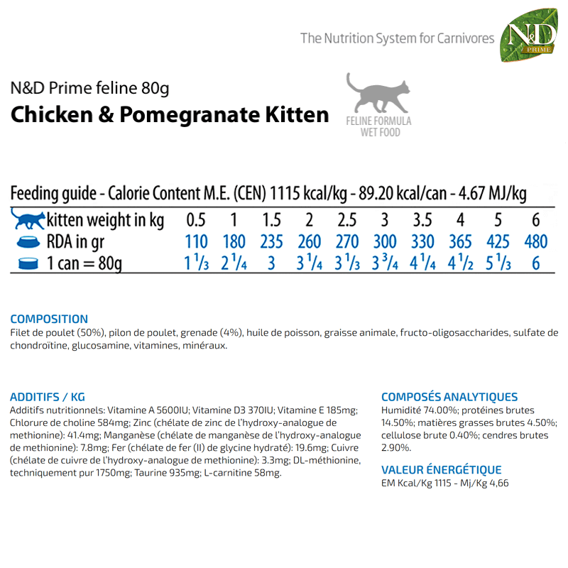 Chaque boîte de N&D Prime Feline est soigneusement préparée avec des ingrédients de haute qualité, y compris du poulet frais et de la grenade. Formulée pour promouvoir le développement sain des chatons et répondre aux besoins nutritionnels des chattes gestantes ou allaitantes, cette formule premium offre une alimentation équilibrée et délicieuse.