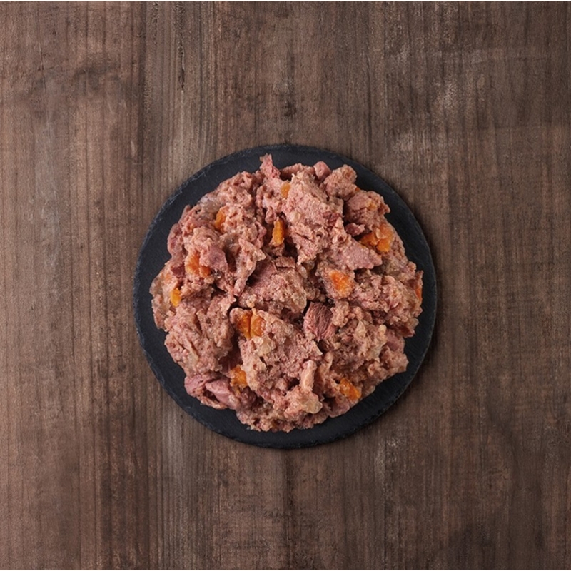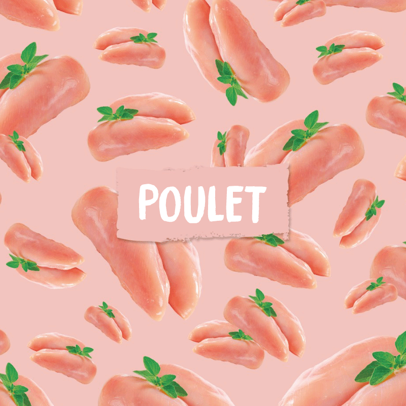Ingrédients : Poulet (65%), bouillon (28,8%), carotte (5%), minéraux, huile d'olive.