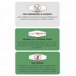 Sans conservateurs ni colorants artificiels : Nous utilisons des conservateurs naturels extraits d'huiles végétales et de plantes. Nous avons totalement éliminé les colorants, assurant qu'il n'y ait pas d'additifs inutiles pouvant affecter la santé de votre chien.
