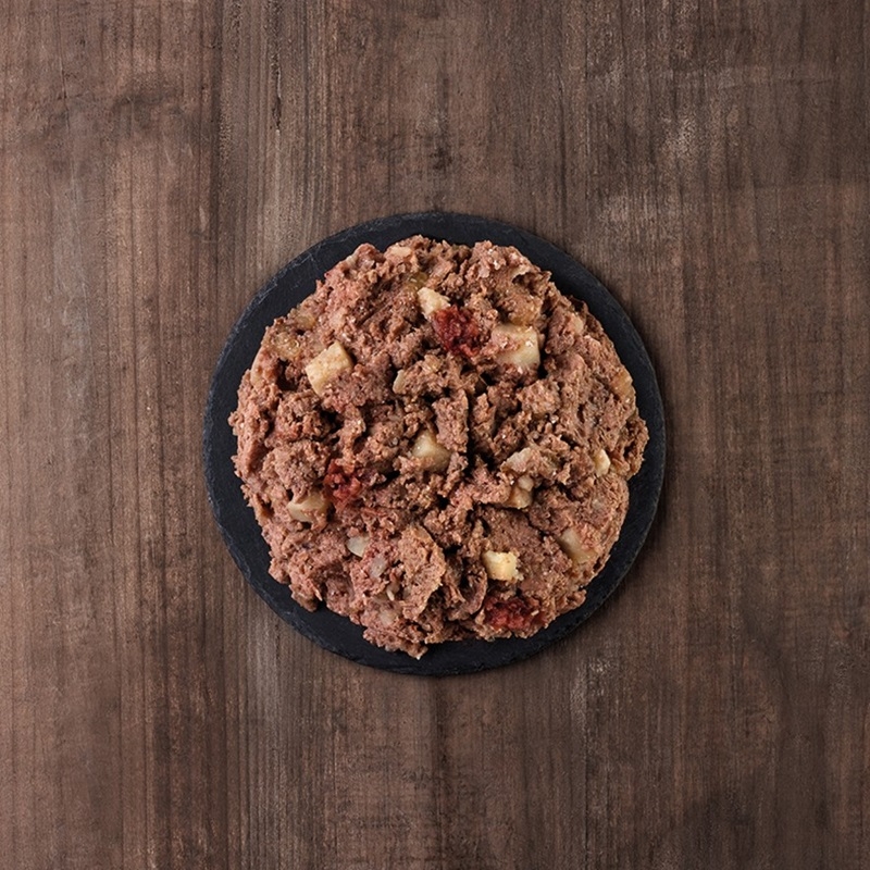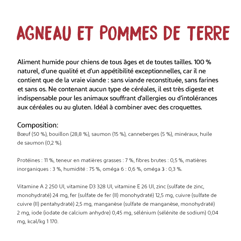 Composition : Agneau (65%), bouillon (28,8%), pomme de terre (5%), minéraux, huile d'olive (0,2%).