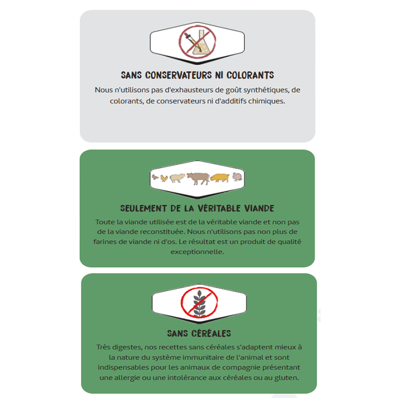 100% d'ingrédients naturels : Nous n'utilisons que des ingrédients frais, locaux et préservant leur valeur nutritive, enrichis en vitamines et minéraux essentiels aux besoins des chiens.