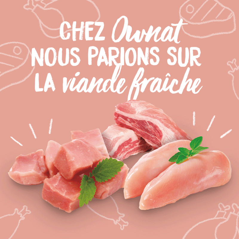 Uniquement des viandes authentiques : Chez OWNAT WETLINE, toutes les viandes utilisées sont authentiques, sans reconstitutions ni farines de viande. Le résultat est une alimentation humide de qualité supérieure répondant aux besoins nutritionnels de votre animal.