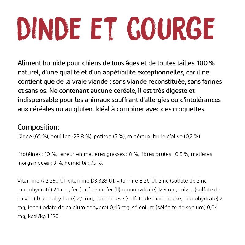 Composition: Dinde (65%), bouillon (28,8%), citrouille (5%), minéraux, huile d'olive (0,2%).