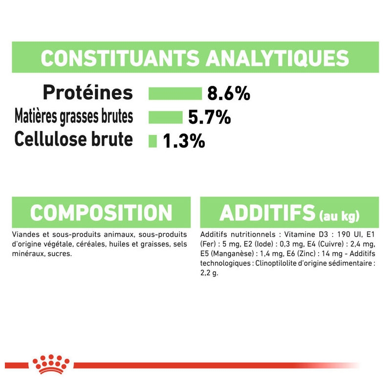 Constituants analytiques : Protéines brutes : 8,6% - Matières grasses brutes : 5,7% - Cendres brutes : 1,9% - Fibres brutes : 1,3% - Humidité : 79,0%.