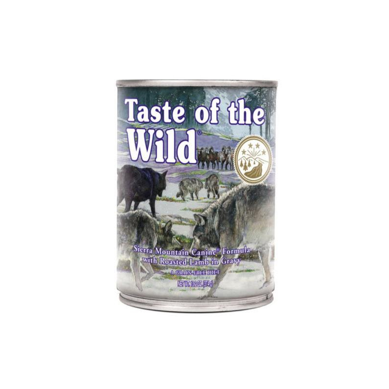 Taste of the Wild Sierra Mountain aliment humide pour chiens (boîtes). Indiqué pour les chiens de toutes races et tailles, avec de l'agneau comme ingrédient principal.