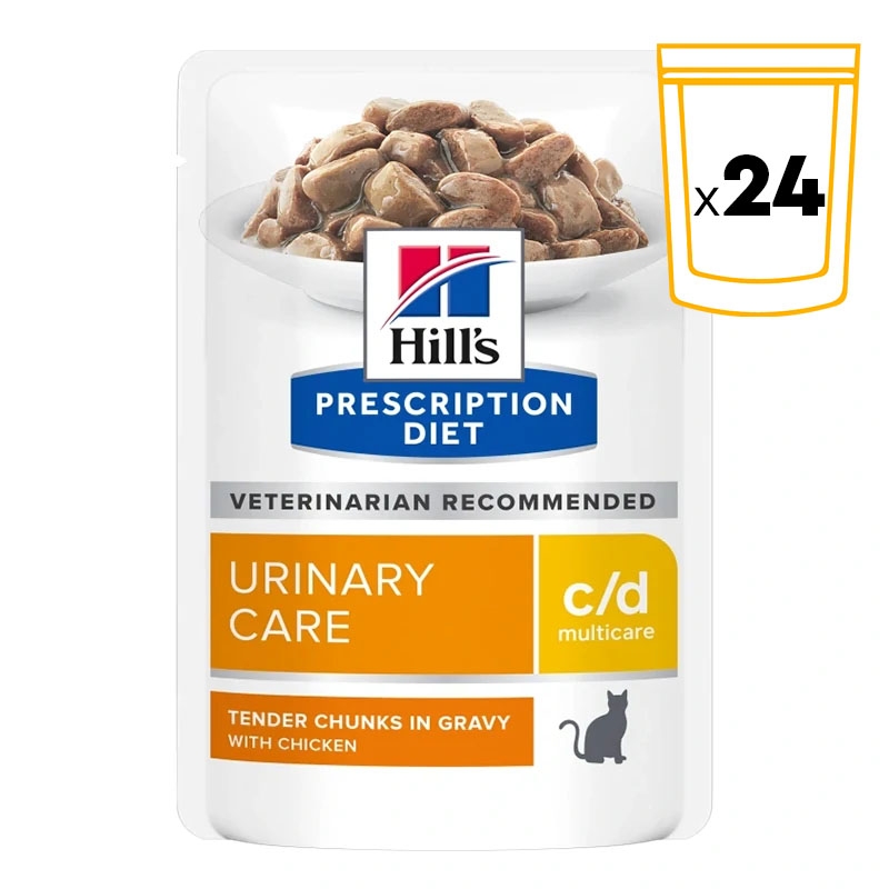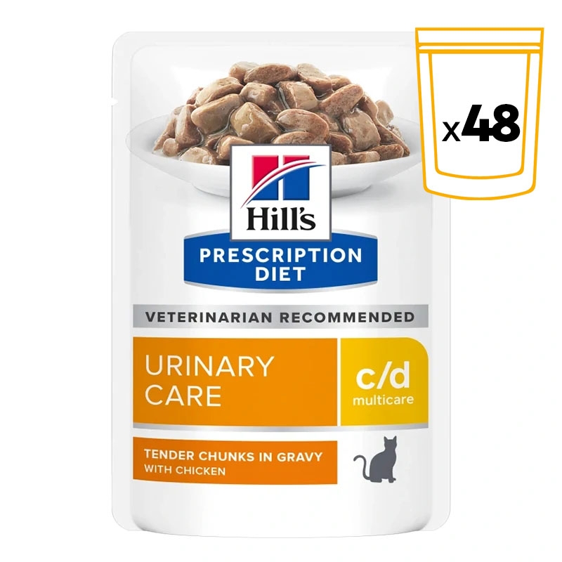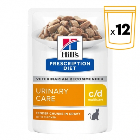 Hill's PRESCRIPTION DIET c/d Multicare en bolsitas pour chats au poulet est un aliment complet et scientifiquement formulé pour traiter les problèmes urinaires chez les chats adultes, y compris les calculs de struvite et d'oxalate.