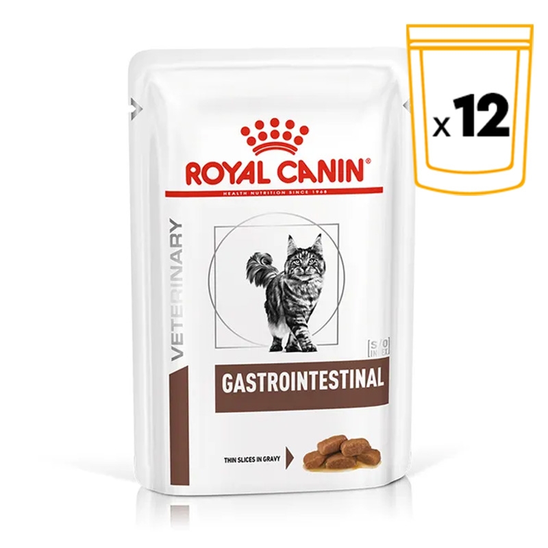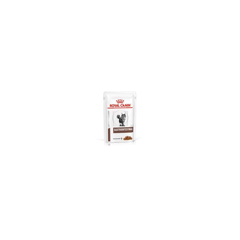 ROYAL CANIN® GASTROINTESTINAL fines lamelles en sauce est une alimentation diététique complète pour chats, formulée pour aider à réduire les troubles aigus de l'absorption intestinale, favoriser la récupération nutritionnelle et la convalescence. Ingrédients hautement digestibles. Niveaux élevés d'électrolytes et haute concentration de nutriments essentiels. Haute densité énergétique. RECOMMANDATIONS : Il est recommandé de consulter un vétérinaire avant de l'utiliser. Utiliser GASTROINTESTINAL fines lamelles en sauce pendant 1 à 2 semaines en cas de diarrhée aiguë et pendant la convalescence jusqu'à rétablissement complet.