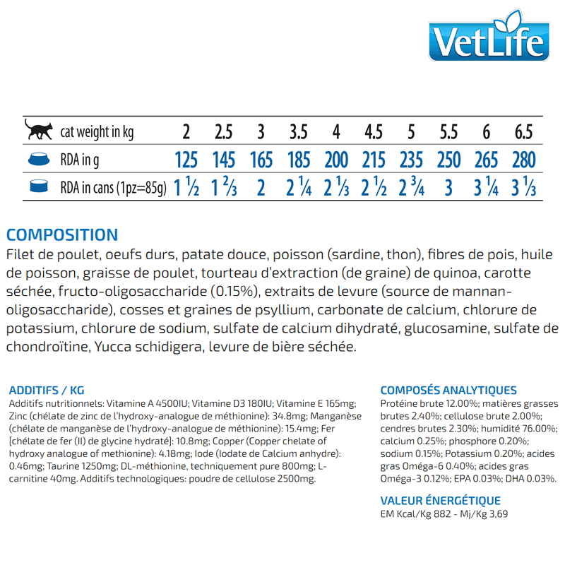 Protéine brute 12,00%; Matières grasses brutes 2,40%; Fibres brutes 2,00%; Cendres brutes 2,30%; Humidité 76,00%; Calcium 0,25%; Phosphore 0,20%; Sodium 0,15%; Potassium 0,20%; Acides gras Omega-6 0,40%; Acides gras Omega-3 0,12%; EPA 0,03%; DHA 0,03%.