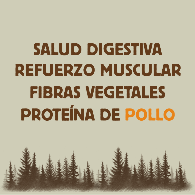 Protéine animale déshydratée (poulet 14 %), maïs, blé, graisse animale, protéines animales hydrolysées, fibres végétales (1 % pulpe de betterave), pois (4 % provenant de 1 % de pois secs), substances minérales, carotte (4 % provenant de 0,,5 % de carotte déshydratée), parois de levures comme source de MOS et Betagluperroos (500 mg/kg), pomme (200 mg/kg), canneberges déshydratées (200 mg/kg).