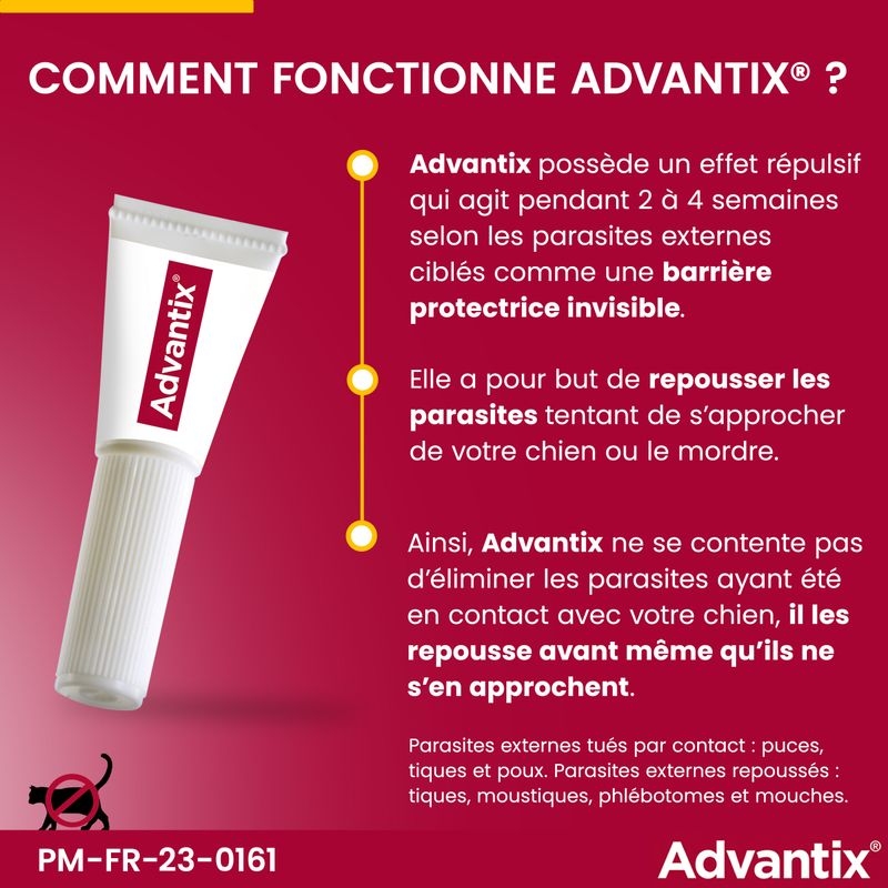 Après avoir appliqué la pipette, les puces (Ctenocephalides canis) meurent en 24 heures et les tiques (Rhipicephalus sanguineus) en 48 heures. Le traitement a également un effet répulsif contre les moustiques phlébotomes (Phlebotomus papatasi). C'est grâce à ces deux ingrédients actifs d'Advantix (l'imidaclopride et la perméthrine) que le système nerveux des insectes est desactivé.