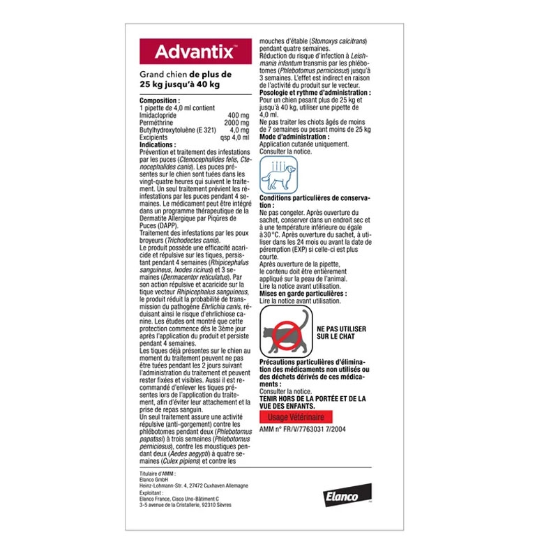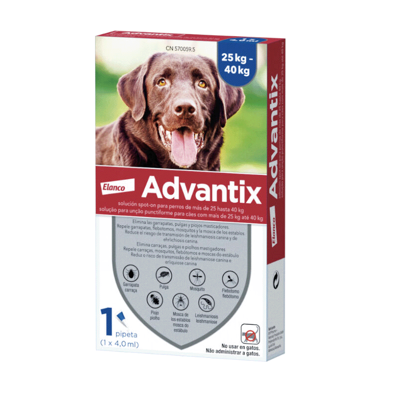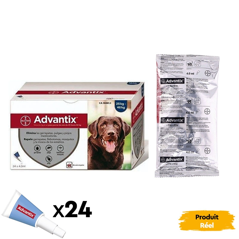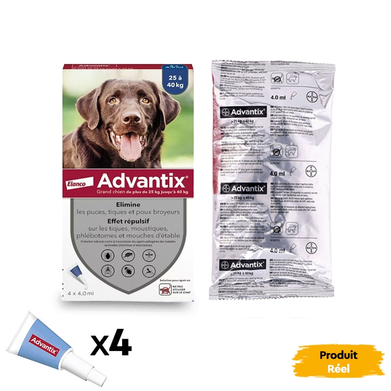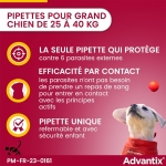 Aussi disponible Advantix 0-4Kg pour chiens mini, Advantix 4-10Kg pour Chiens Petits et Advantix 10-25Kg pour chiens de taille moyènne.