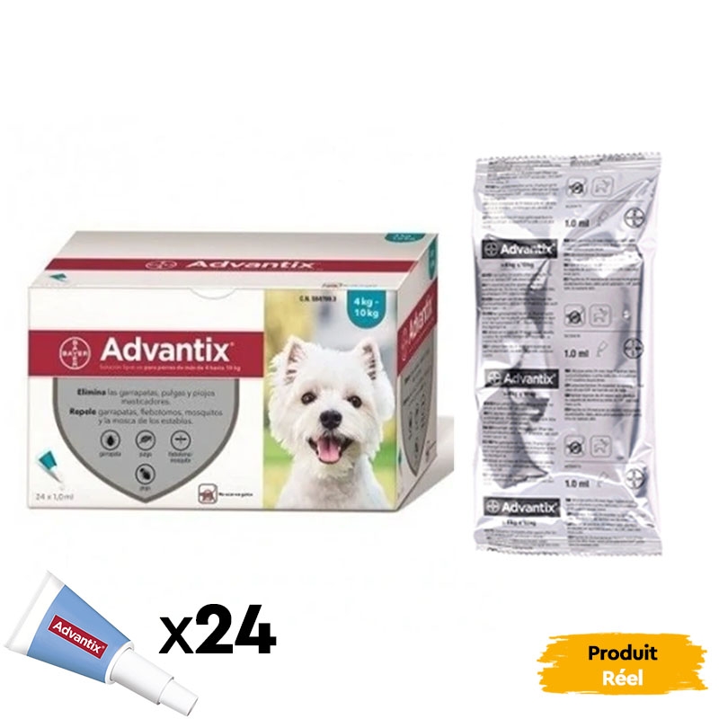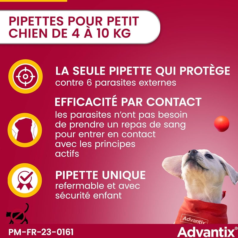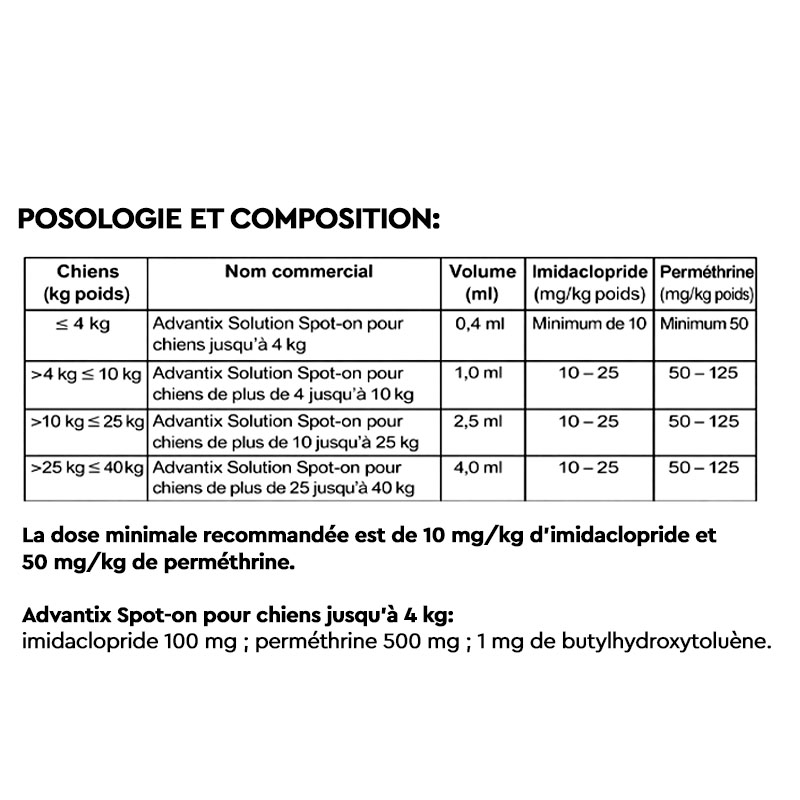 Aussi disponible : Advantix 0-4 kg pour chiens mini, Advantix 4-10 kg pour chiens petits et Advantix 10-25 kg pour chiens de taille moyenne.