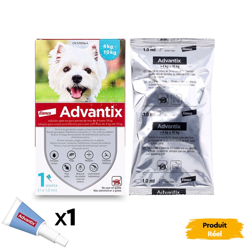 Advantix +10 kg est une pipette antiparasitaire conçue pour les chiens de petite race avec un poids compris entre 4 et 10 kg. Cette pipette, produite par les Laboratoires Bayer, a été créée pour prévenir et réduire l'apparition des tiques, des puces, des moustiques et d'autres insectes pendant 4 semaines. Consultez votre vétérinaire pour vérifier si c'est un traitement adapté à votre chien.