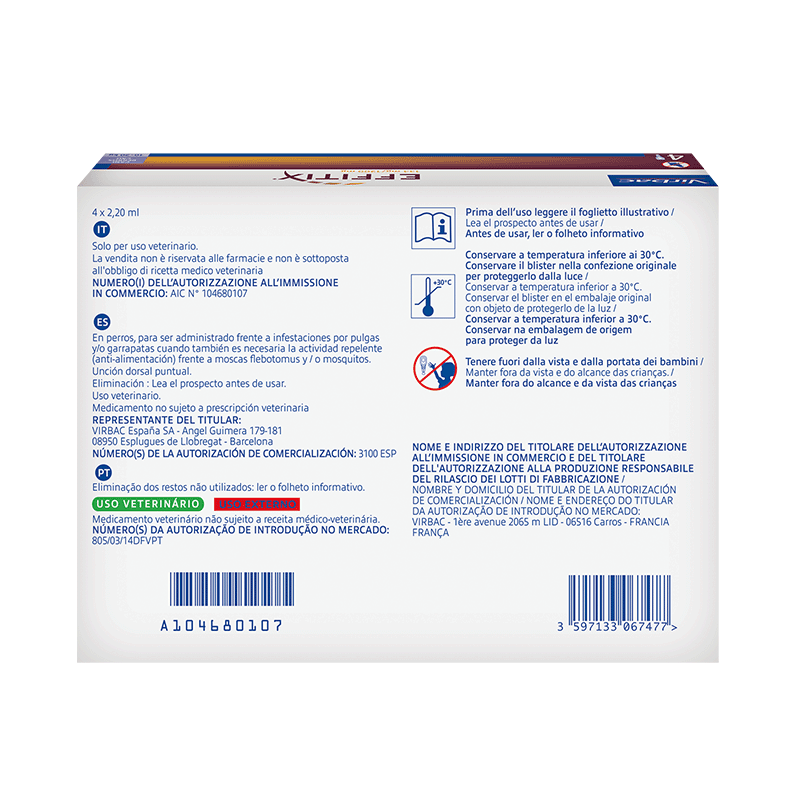 Les Pipettes Effitix de Virbac pour chiens de taille moyenne, pesant entre 10 et 20 kg, représentent la dernière innovation en matière de répulsifs externes, fournissant une défense complète contre les tiques, les puces, les moustiques et les phlébotomes pendant quatre semaines. Conçues au format spot-on pour une application directe sur la peau, ces pipettes offrent une prévention efficace contre les ectoparasites, vecteurs potentiels de maladies telles que la leishmaniose, la babésiose, la borréliose et le ver du cœur.