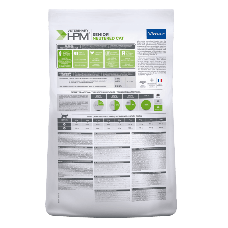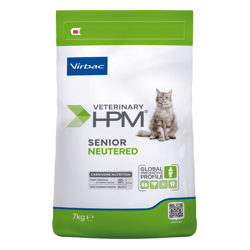 Le Veterinary HPM Senior Cat de Virbac est une alimentation complète conçue pour les chats stérilisés, spécialement formulée pour ceux qui ont atteint l'âge de 10 ans.