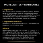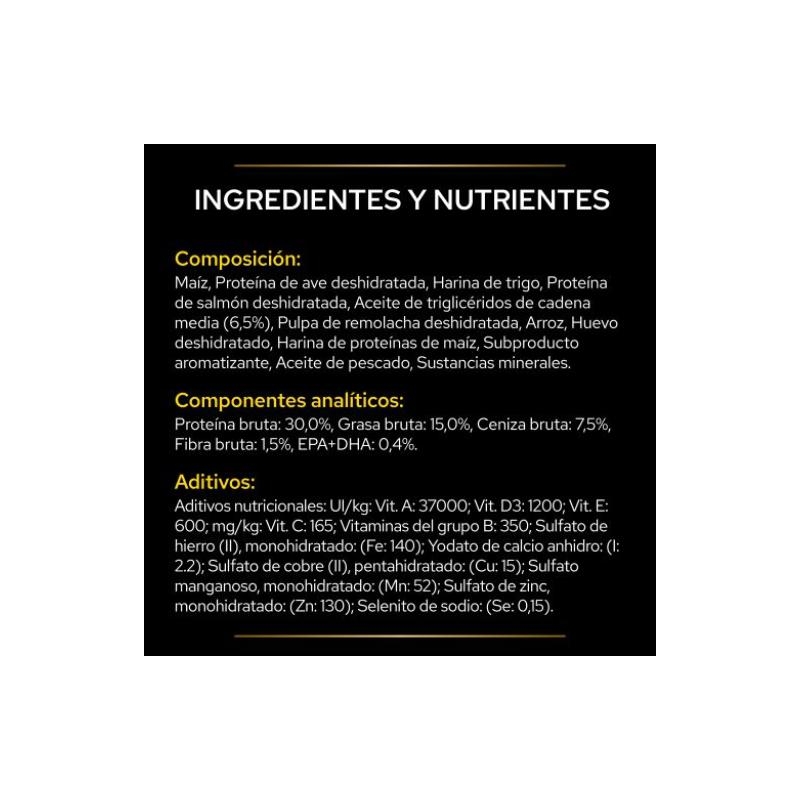 Maïs, protéines de volaille déshydratées, farine de blé, protéines de saumon déshydratées, huile de triglycérides à chaîne moyenne (6,5 %), pulpe de betterave déshydratée, riz, œuf déshydraté, farine de gluten de maïs, hydrolysat de protéines, huile de poisson, minéraux.
