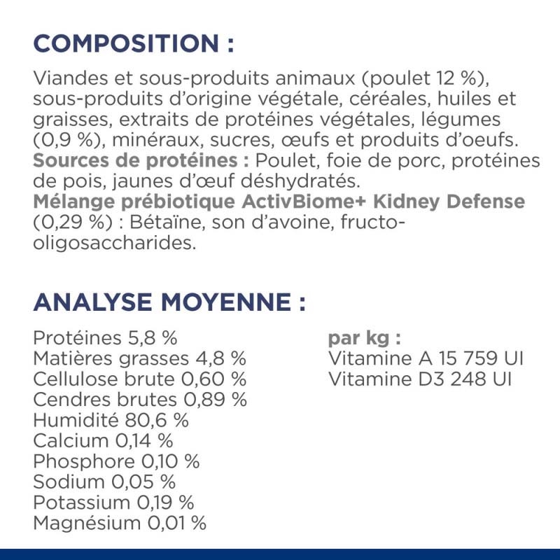 COMPOSITION : Viande et dérivés d'animaux, dérivés d'origine végétale, huiles et graisses, divers sucres, minéraux. Source de protéines : Foie de porc. Combinaison de probiotiques ActivBiome+ pour le soin rénal (0,33%) : Bétaïne, son d'avoine, fructo-oligosaccharides.