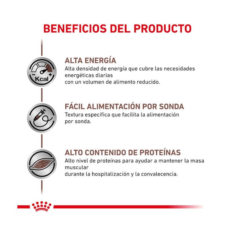 Contient une concentration élevée de protéines pour préserver la masse musculaire de votre animal pendant son séjour à l'hôpital et le processus de récupération.