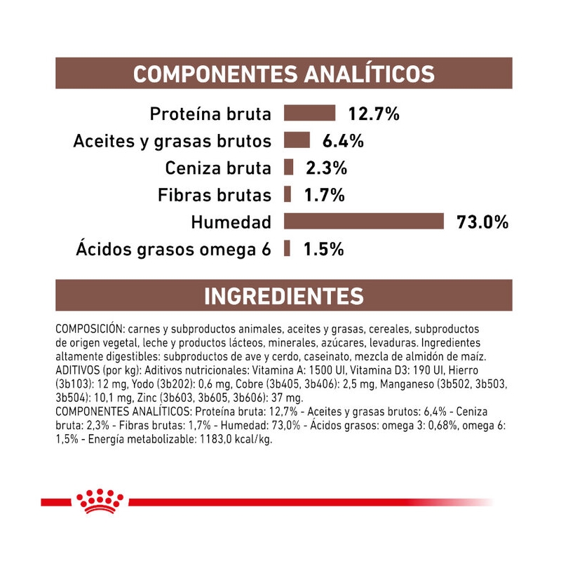 Constituants analytiques : Protéine brute : 12,7% - Matières grasses brutes : 6,4% - Cendres brutes : 2,3% - Fibres brutes : 1,7% - Humidité : 73,0% - Acides gras : oméga 3 : 0,68%, oméga 6 : 1,5% - Énergie métabolisable : 1183,0 kcal/kg.