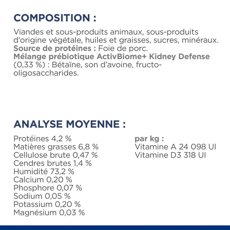 Combinaison de prébiotiques ActivBiome+ Kidney Defense (0,33%) : Bétaïne, son d'avoine, fructo-oligosaccharides.