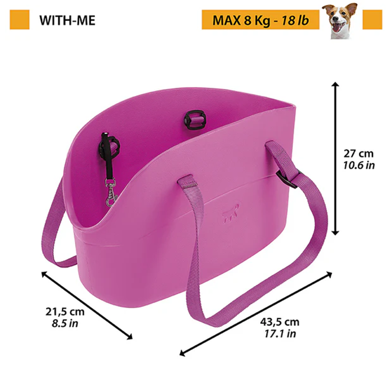 Ce sac pour petits chiens est fabriqué grâce à une matière caoutchoutée appelée EVA (éthylène-acétate de vinyle). Doux et confortable, il est robuste, élégant et pourra même être utilisé comme sac à provisions. Fabriqué en Italie, il est disponible en différentes couleurs à la mode, original, il s'adaptera parfaitement aux autres accessoires de votre chien pour un look branché. Les anses robustes sont réglables et permettront de porter le sac à la main ou sur l'épaule. La ceinture de sécurité intérieure peut être fixée au collier de votre animal. Matériau hygiénique, lavable et imperméable à l'eau. With-Me est conseillé pour des chiens d'un poids maximal de 8 kg. Facile à entretenir, ce sac peut être nettoyé avec un savon doux et de l'eau.