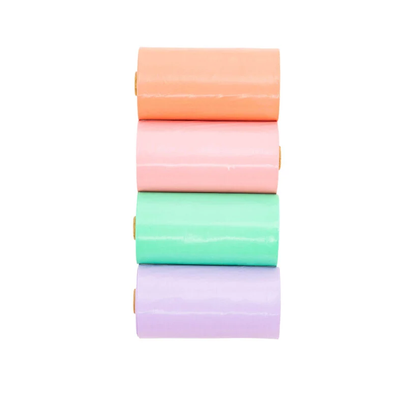 Paquete con 4 rollos de 15 bolsas higiénicas ecológicas para perros, en colores pasteles, resistentes, ligeras y sostenibles.