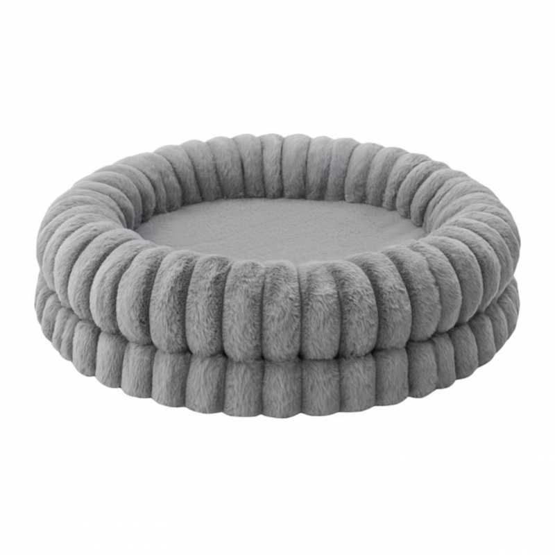 Cama tipo cuna para perros y gatos en color gris, con diseño circular y bordes acolchados, suave y cálida, envasada al vacío y lista para usar en segundos.