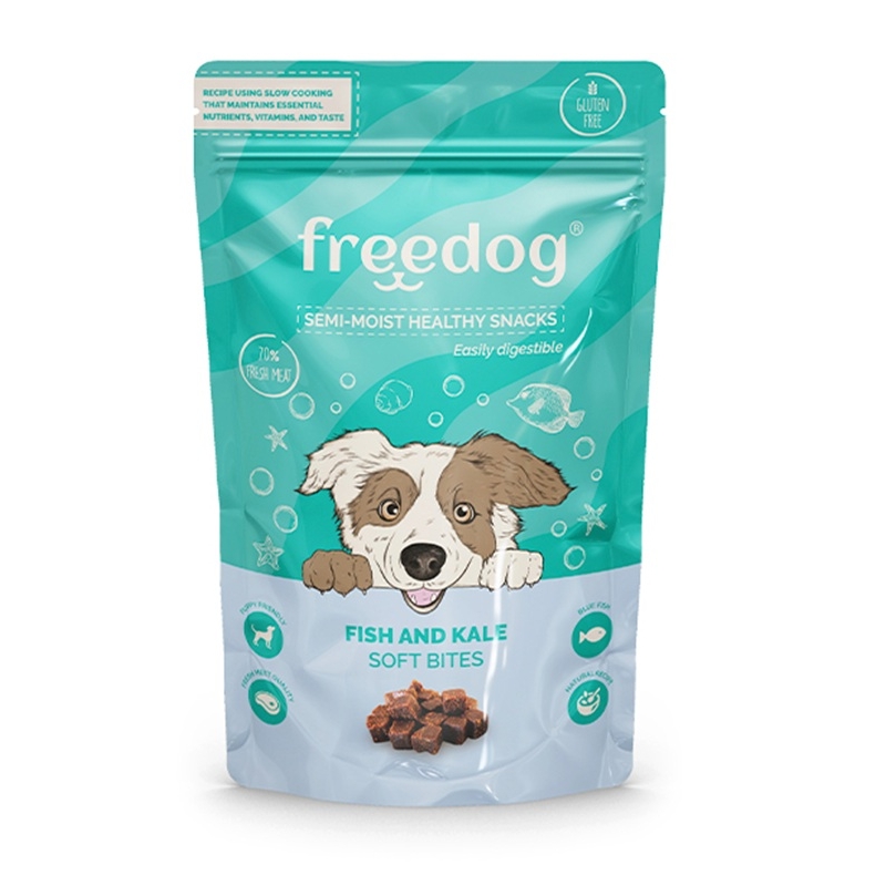 Bolsa de Freedog Snack Semi-húmedo con Pescado Azul y Col, una opción sabrosa, natural y nutritiva para cuidar la salud y el bienestar de tu perro.