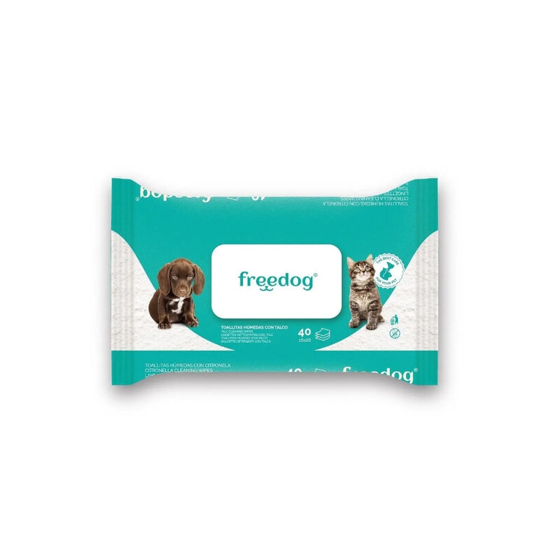 Mantén a tu peludo siempre limpio y con un aroma agradable gracias a las toallitas húmedas con talco para perros y gatos de Freedog. Enriquecidas con aloe vera y talco, limpian, hidratan y calman la piel, dejando el pelaje suave y fresco en cada pasada. Son hipoalergénicas y adecuadas para el uso diario en animales de todas las razas y edades.