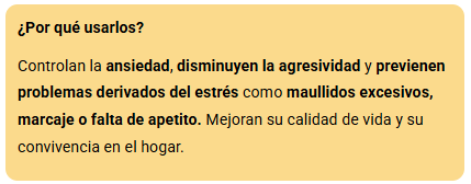 Controlan la ansiedad, disminuyen la agresividad y previenen problemas derivados del estrés como maullidos excesivos, marcaje o falta de apetito. Mejoran su calidad de vida y su convivencia en el hogar.