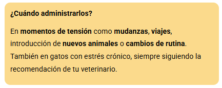 En momentos de tensión como mudanzas, viajes, introducción de nuevos animales o cambios de rutina. También en gatos con estrés crónico, siempre siguiendo la recomendación de tu veterinario.