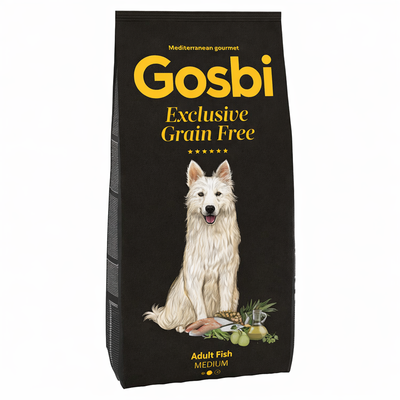 Gosbi Exclusive Grain Free Adult Fish Medium es un pienso sin cereales y sin carne, formulado específicamente para perros adultos de razas medianas que necesitan una alimentación altamente digestiva y bien tolerada. Esta receta utiliza exclusivamente proteína de origen marino, con salmón y pescado azul como fuentes principales, convirtiéndose en una excelente alternativa para perros con sensibilidad alimentaria o intolerancia a las carnes tradicionales.