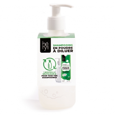 Bote de dilución para champú en polvo diseñado para preparar de forma fácil y precisa los champús Hery, con capacidad de 250 ml y un formato reutilizable y práctico.