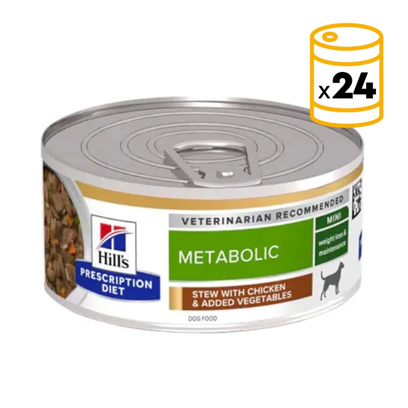 Hill's Prescription Diet Metabolic es una nutrición clínica especialmente formulada para ayudar a los perros a perder peso y mantener el peso perdido. Incluso un leve sobrepeso puede reducir la calidad de vida de tu perro, afectar su movilidad y disminuir su vitalidad diaria. Este alimento húmedo con pollo y verduras en textura de estofado está pensado para facilitar una pérdida de peso efectiva sin que tu perro pase hambre.