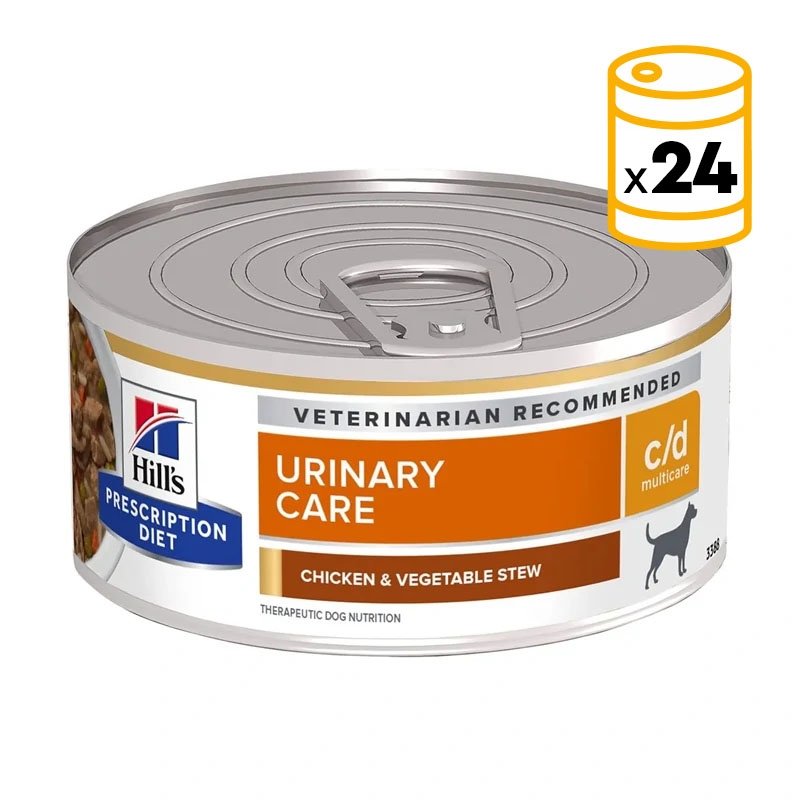 Hill's Prescription Diet c/d Multicare es una nutrición clínica especialmente formulada para favorecer la salud urinaria y reducir el riesgo de formación de cálculos de estruvita y oxalato cálcico en perros. Su textura con trozos pequeños y su delicioso sabor a pollo lo convierten en una opción altamente palatable, incluso para perros con poco apetito.