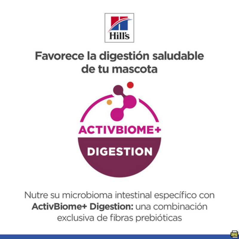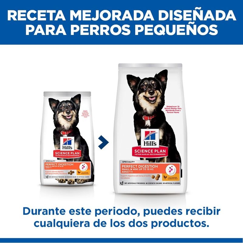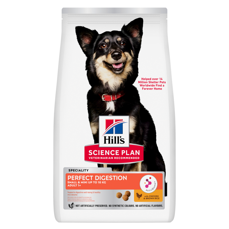 Hill’s Science Plan Perfect Digestion Small & Mini está formulado con ActivBiome+, la exclusiva mezcla de prebióticos de Hill’s que ayuda a equilibrar el microbioma y favorece una digestión saludable en tu peludo de talla pequeña.