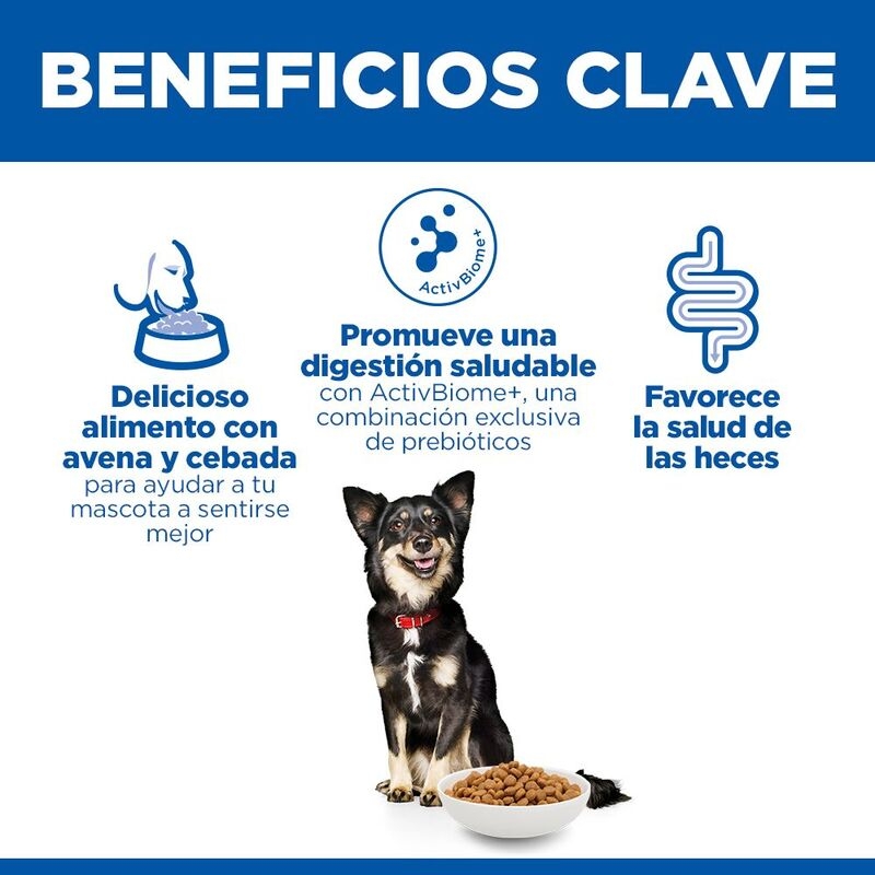 Pienso digestivo para perros pequeños y mini con ActivBiome+: mezcla de prebióticos que apoya microbioma saludable, heces regulares y energía equilibrada gracias a pollo y arroz integral.