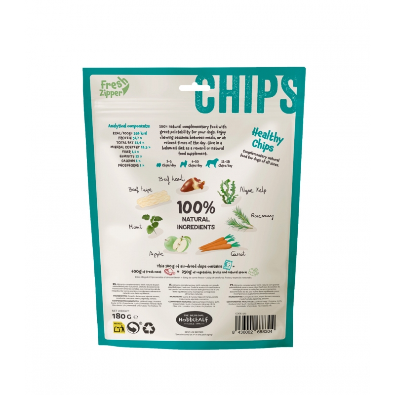 Healthy Chips Fresh Dental para perros es un snack funcional y natural diseñado como complemento saludable para cualquier tipo de alimentación: croquetas, dieta cruda o mixta. Inspirado en la filosofía BARF, combina proteína animal de alta calidad con vegetales, frutas y superalimentos seleccionados para apoyar la salud bucodental de forma diaria.