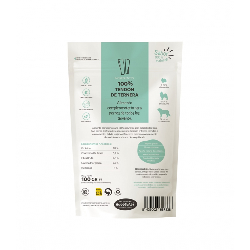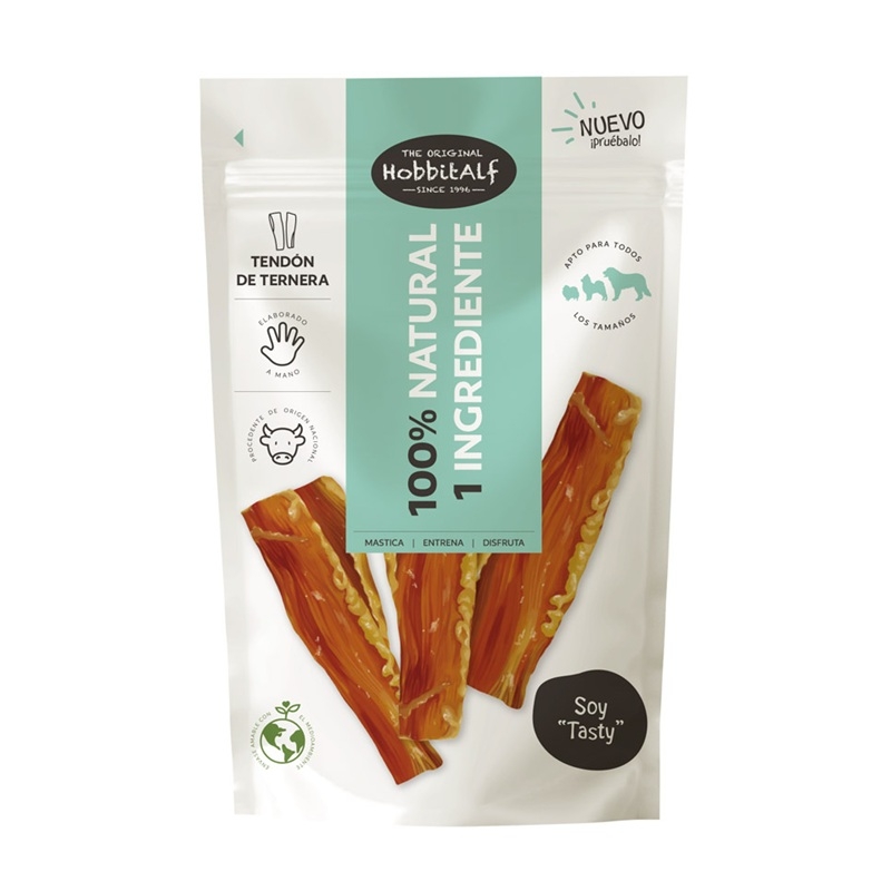 El tendón de ternera para perros es un snack 100% natural elaborado exclusivamente con un único ingrediente de origen animal. Gracias a su textura firme y resistente, es un masticable ideal para perros que necesitan roer durante más tiempo, ayudando a mantenerlos entretenidos mientras disfrutan de un premio simple y sin añadidos innecesarios.