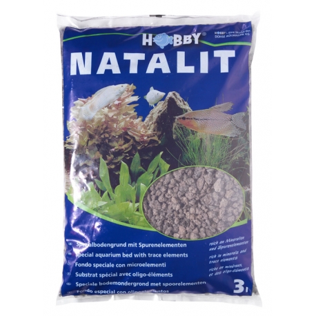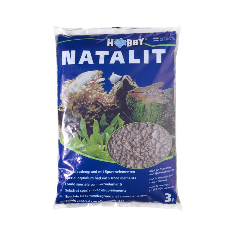 Hobby Fish Natalit 3 L, sustrato oscuro de lava que favorece el desarrollo de las raíces y el crecimiento vigoroso en acuarios plantados.