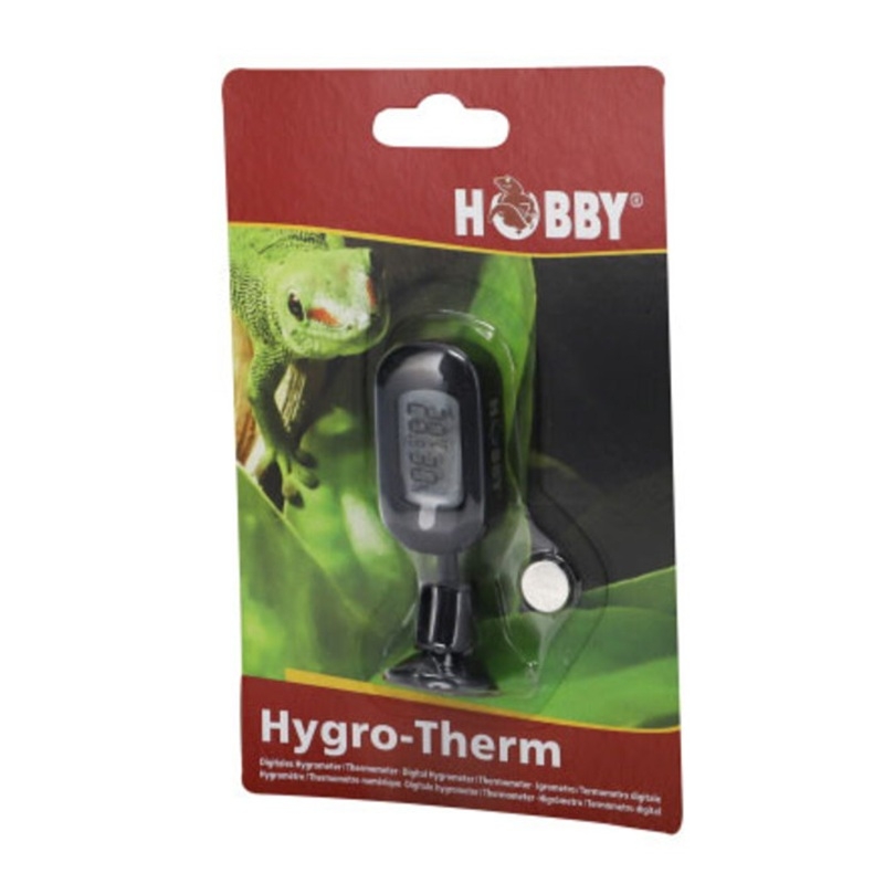 Hobby Reptil Hygro-Therm es un termómetro e higrómetro digital compacto diseñado para medir con precisión la temperatura y la humedad del terrario. Su formato pequeño y manejable permite colocarlo fácilmente sin interferir en la decoración del hábitat.