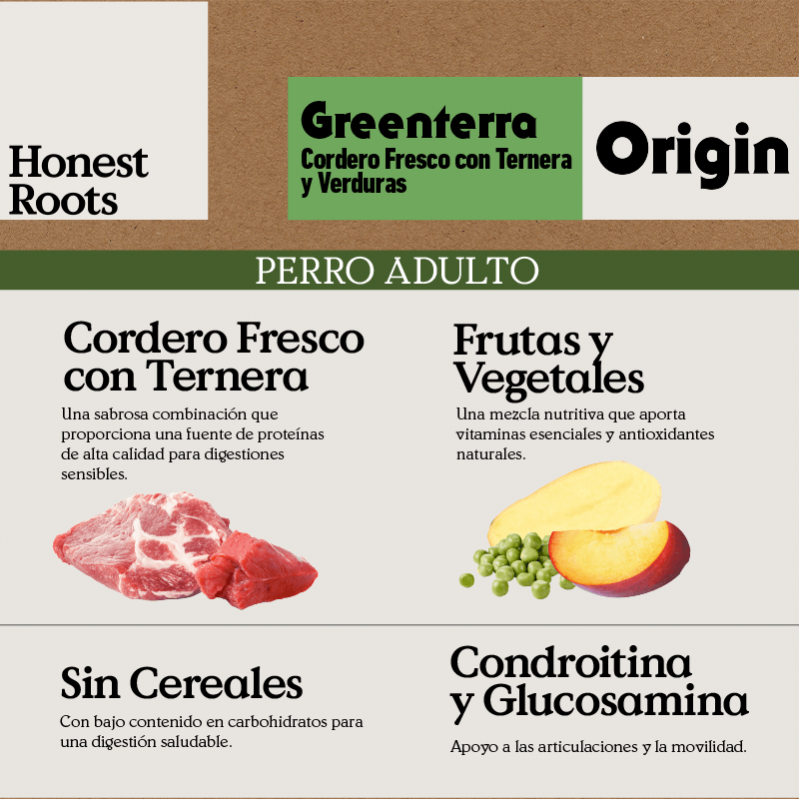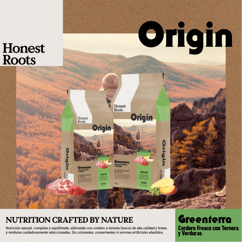 Honest Roots Origin Greenterra es un pienso natural para perros adultos formulado con cordero fresco y vacuno como fuentes principales de proteína animal. Esta receta grain free está inspirada en la alimentación natural del perro, proporcionando una nutrición completa, equilibrada y fácilmente digerible, ideal para animales con estómagos sensibles o digestiones delicadas.