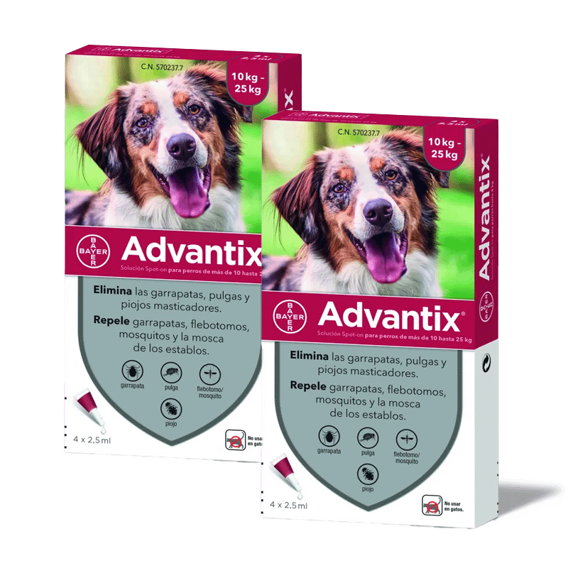 Advantix +25 kg è una pipetta antiparassitaria appositamente formulata per cani di taglia media con un peso compreso tra 10 e 25 kg. Prodotta dai Laboratori Bayer, questa pipetta è stata creata per prevenire e ridurre l'insorgenza di zecche, pulci, zanzare e altri insetti per 4 settimane. Consultare il veterinario per verificare se è un trattamento adatto al proprio cane.