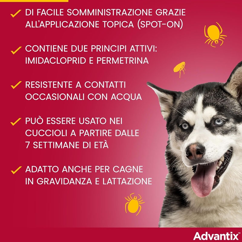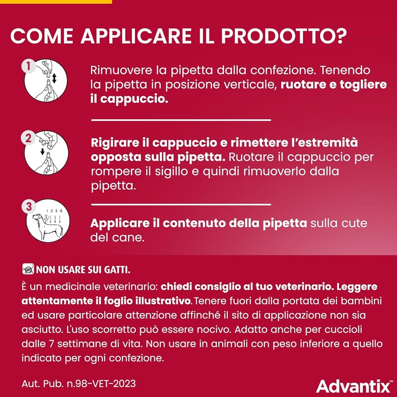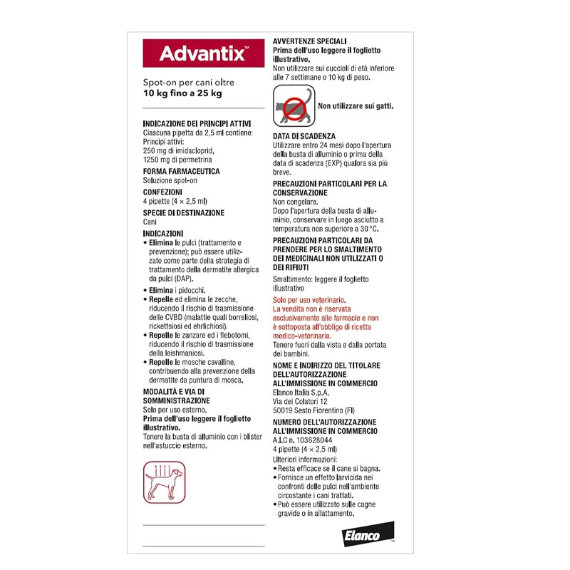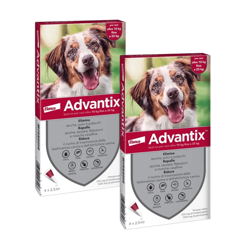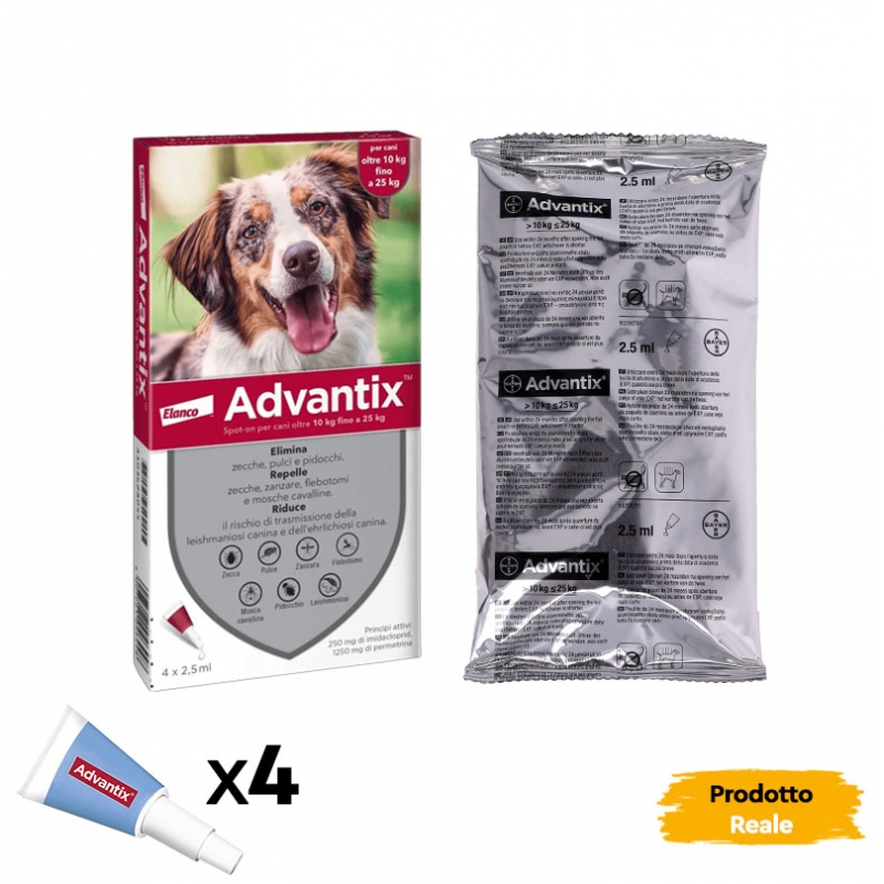Disponibile anche in formato : Advantix 0-4 kg per cani mini, Advantix 4-10 kg per cani piccoli e Advantix 10-25 kg per cani di taglia media.