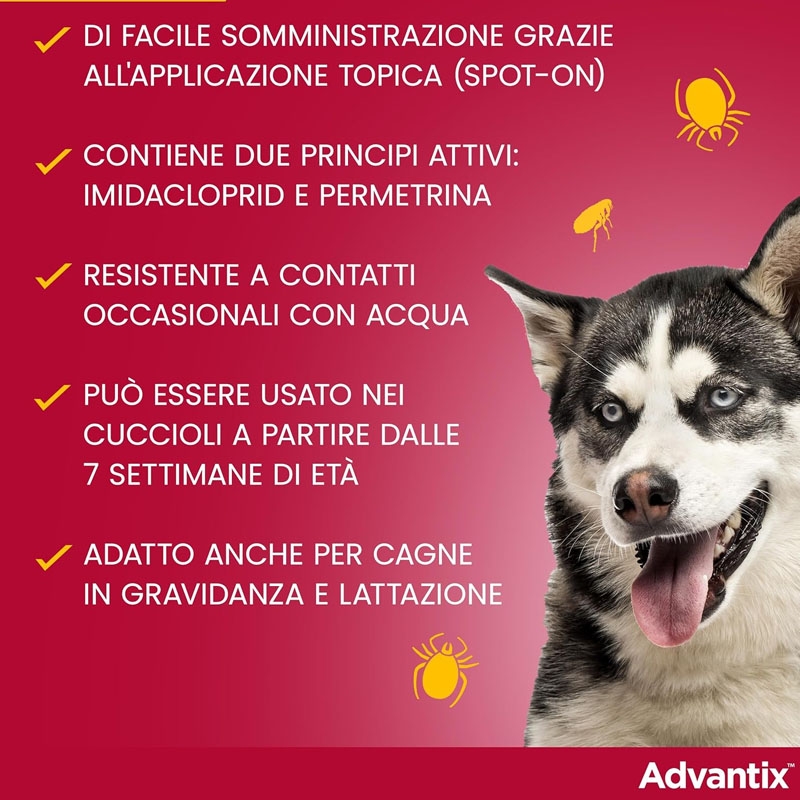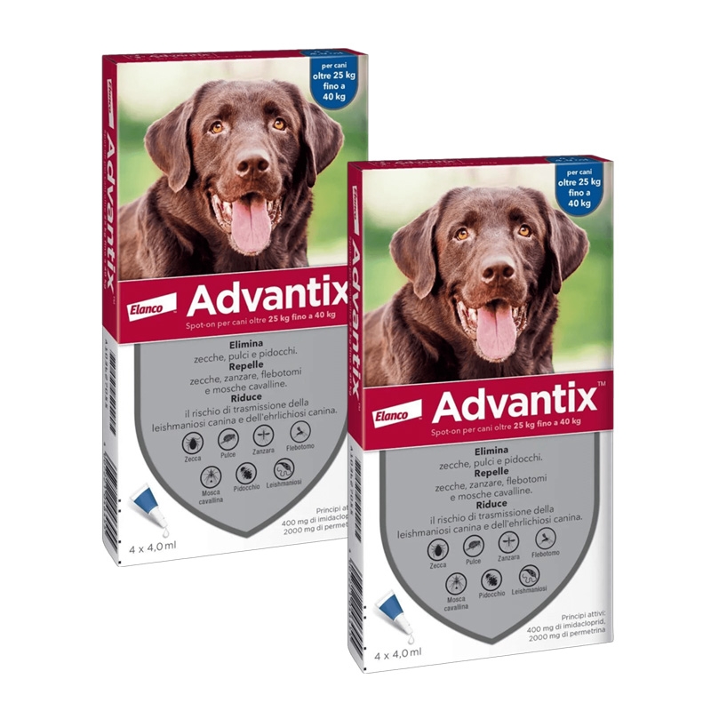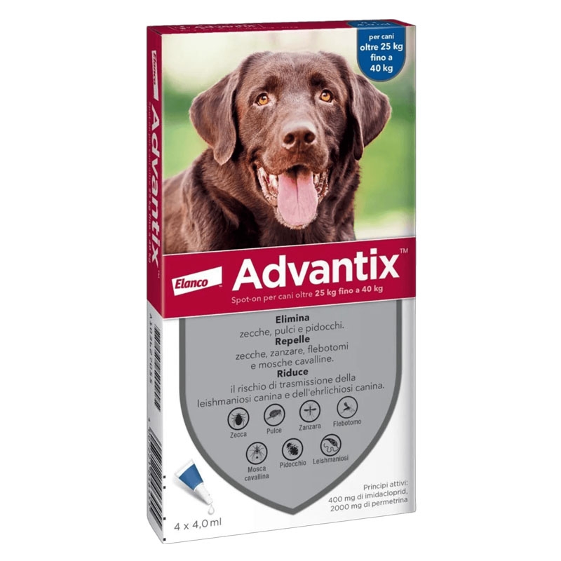 Disponibile anche Advantix 0-4Kg per cani mini, Advantix 4-10Kg per cani piccoli e Advantix 10-25Kg per cani di taglia media.